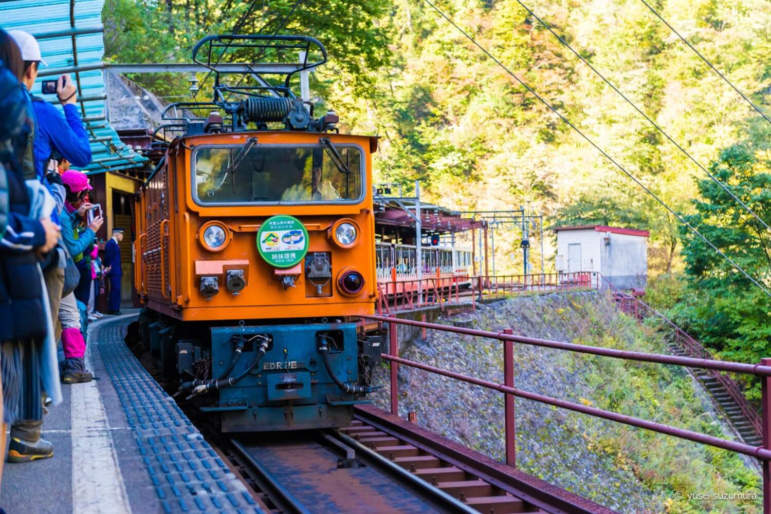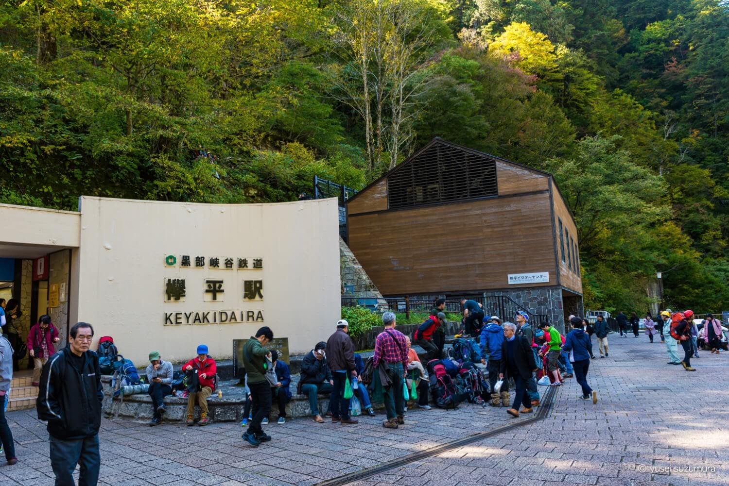 欅平駅にはトロッコ電車で紅葉を見に来た観光客でごった返していましたが、水平歩道を歩いてきた登山者はヘルメットとアウトドアウェアですぐにわかります。