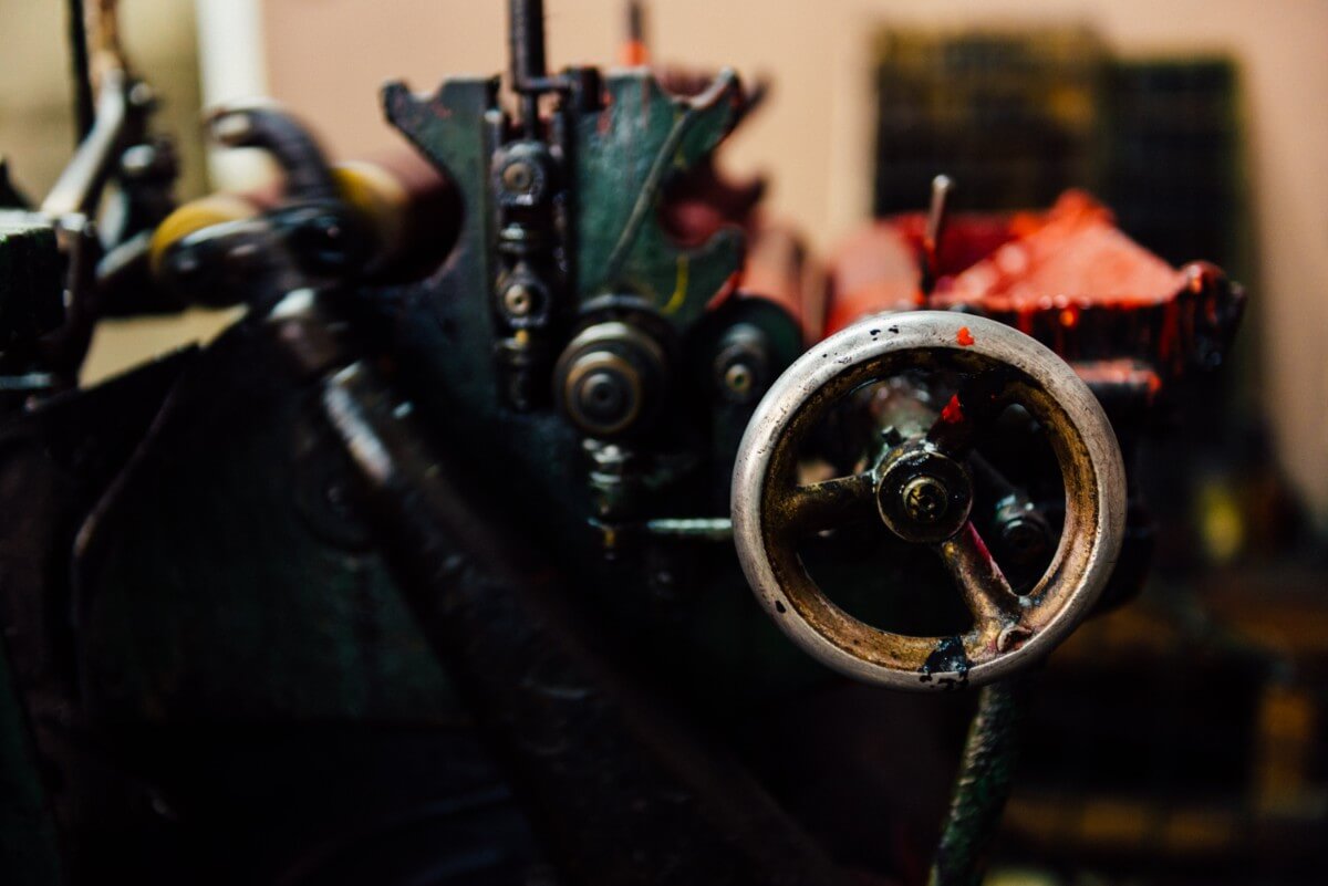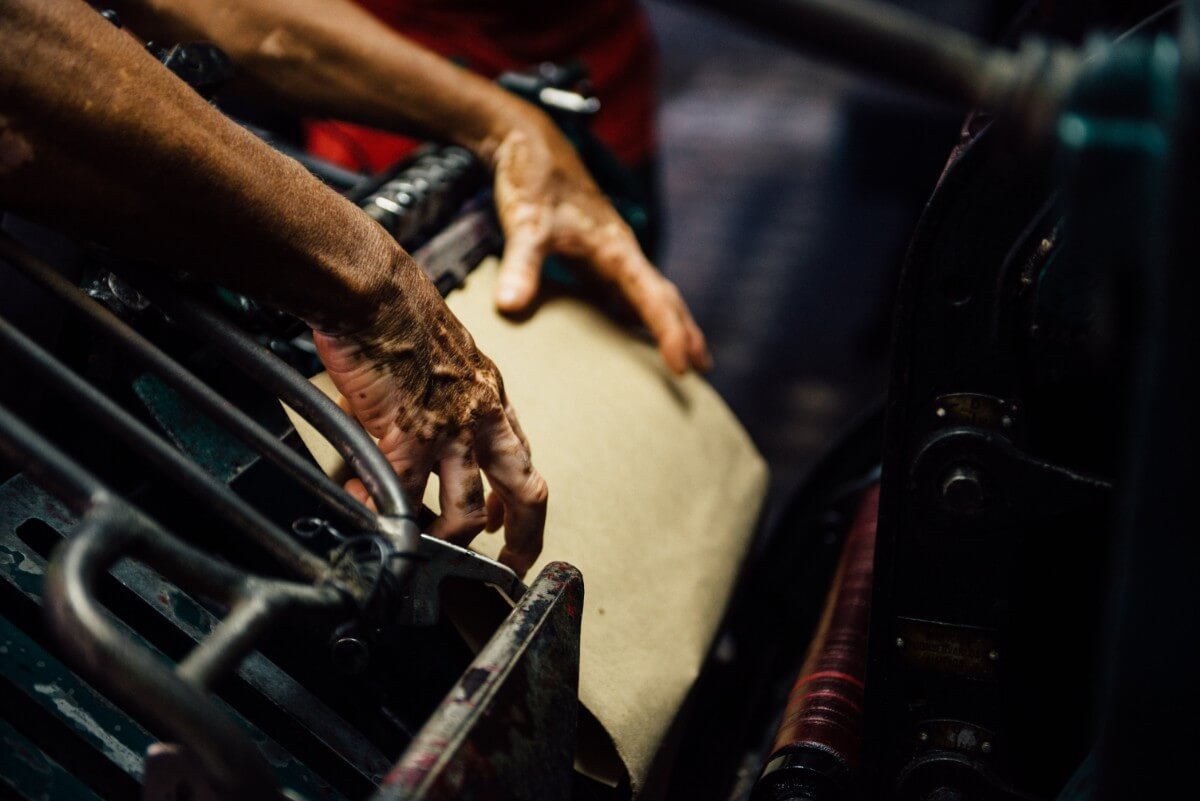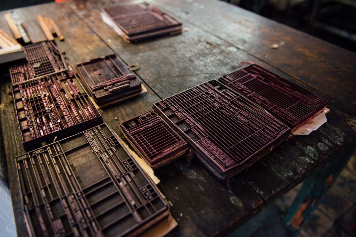 活版印刷とは凸版印刷の一種で、活字を並べて文章にした組版を作り、それに塗料を塗って印刷すること。原理はハンコを押印するのと一緒です。
