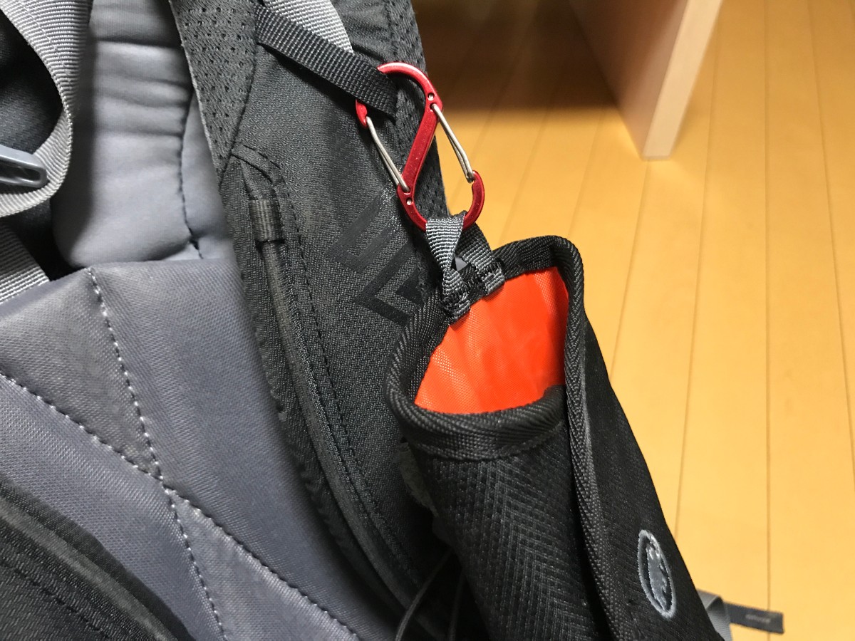 ただし、ベルクロだけだと重力や振動でどんどんボトルホルダーが下に落ちてくるので、別にカラビナでザックに固定すると安定しますよ。