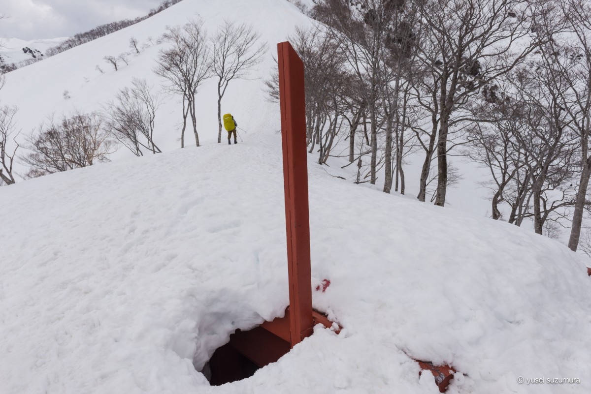 いろんな山ブログでこの熊穴沢避難小屋がどのくらい雪に覆われているのかで積雪量を判断するなんて書いてましたが、自分が訪れたときには煙突的な部分まで埋まっていました。結構雪が積もっている!?