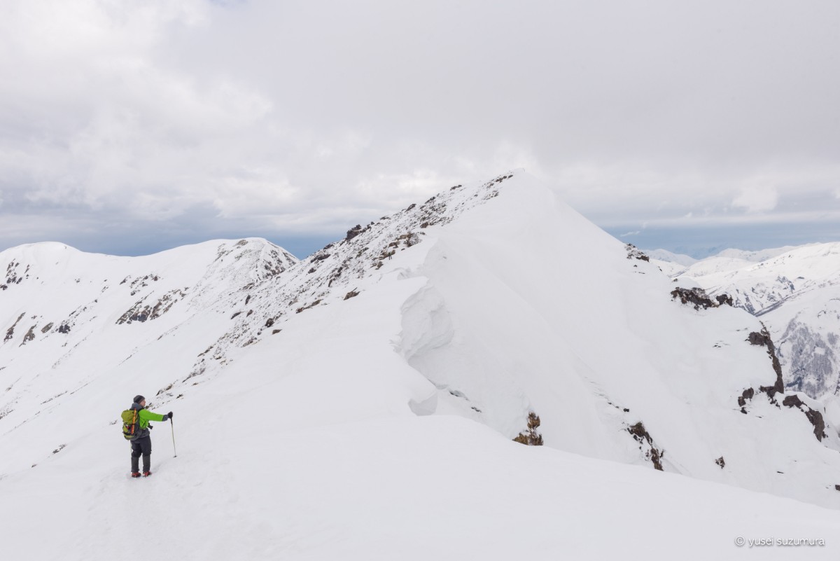 ここからはさらに谷川岳のもう一つの山頂であるオキノ耳へ。しかし、雪庇がやばいですね。少しでも右にずれると雪庇を踏み外して滑落です。