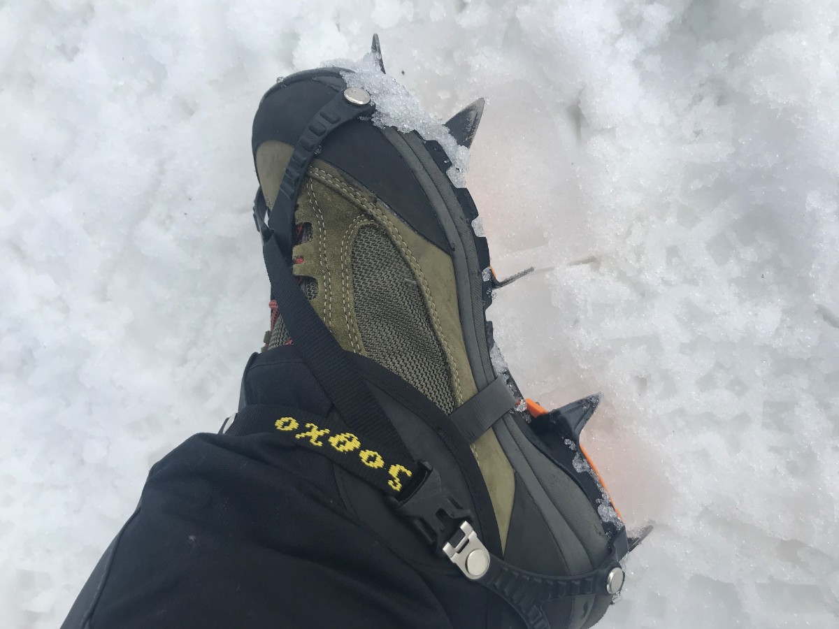 オクトスの10本爪アイゼンはラチェット式なのでまるでスキー板とスキー靴の装着のように簡単にアイゼンと登山靴を装着できました。これ良いです。
