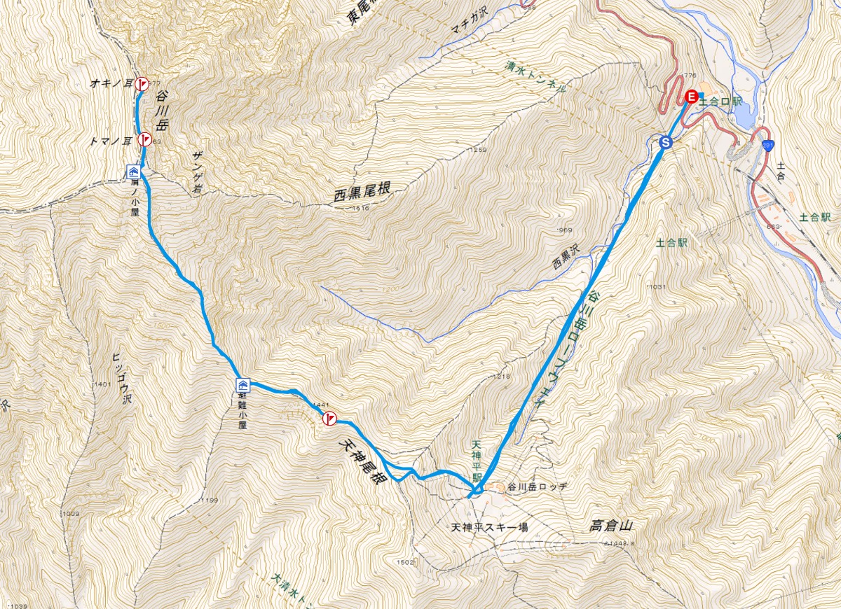 谷川岳ベースプラザ(9時43分)→熊穴沢避難小屋(11時11分)→谷川岳・肩の小屋(12時17分)→谷川岳(トマノ耳)(12時29分)→谷川岳(オキノ耳)(12時47分)→谷川岳・肩の小屋(13時36分)→熊穴沢避難小屋(14時39分)→谷川岳ベースプラザ(16時8分)