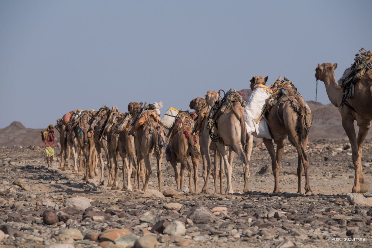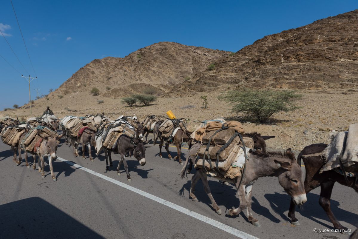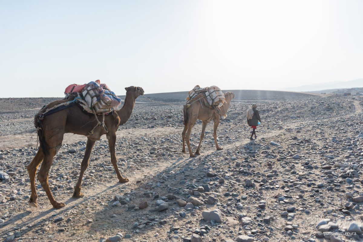 ダナキル砂漠(アサレ湖)は塩が資源なので、ダナキル砂漠で塩を切り出して別の採掘者が一定の大きさに揃え、紐で縛りまとめ、ラクダやロバにくくりつけて街まで運びます。
