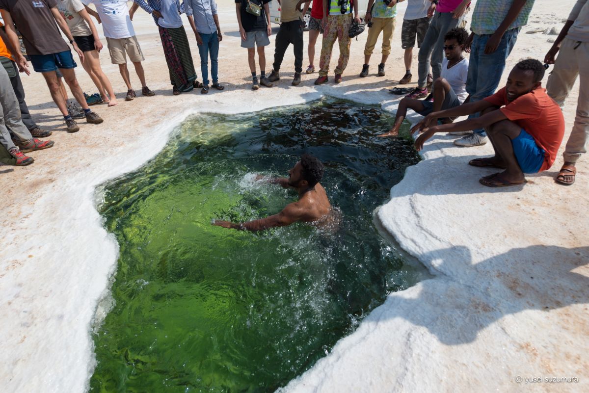 ダロール火山が終わったら、再び塩湖へ。ここではその大地を見たり、塩湖のプールに入ったりしました。